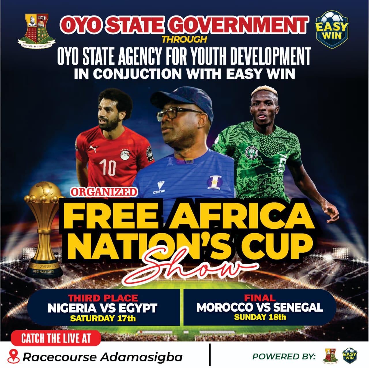 While confirming the development, the Chairman of the Oyo State Agency for Youth Development, Hon. Adebowale Adebayo Falana, assured that the designated viewing centres at the Racecourse, Adamasingba Stadium, have been fully equipped with large LED screens, quality sound systems, and adequate security to guarantee a safe and enjoyable experience for all attendees.