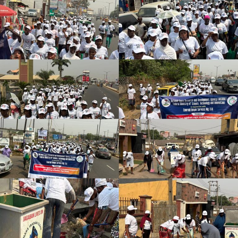 In furtherance of the renewed hope agenda of President Bola Ahmed Tinubu, the Federal Ministry of Science, Technology and Innovation through the National Space Research and Development Agency (NARSDA) collaborated with two different organizations on rape awareness and unwanted pregnancy sensitization, as well as Cleaning activities across a number of communities in Ibadan, Oyo State.
