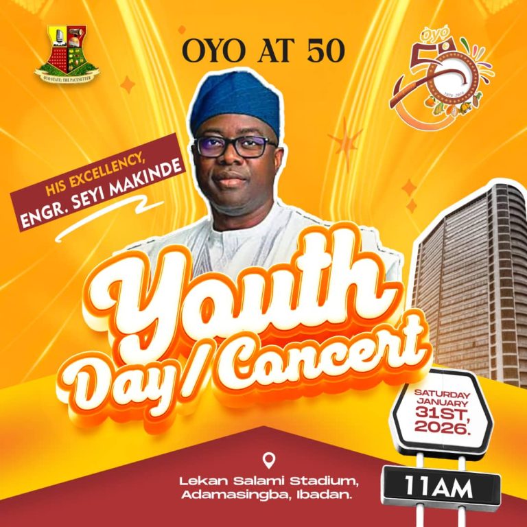 The event, titled “Oyo @50 “Youth Day & Mega Carnival,” will take place on Saturday, 31st January, at the Adamasingba Stadium, Ibadan, with activities commencing at 11:00 am and continuing until late.