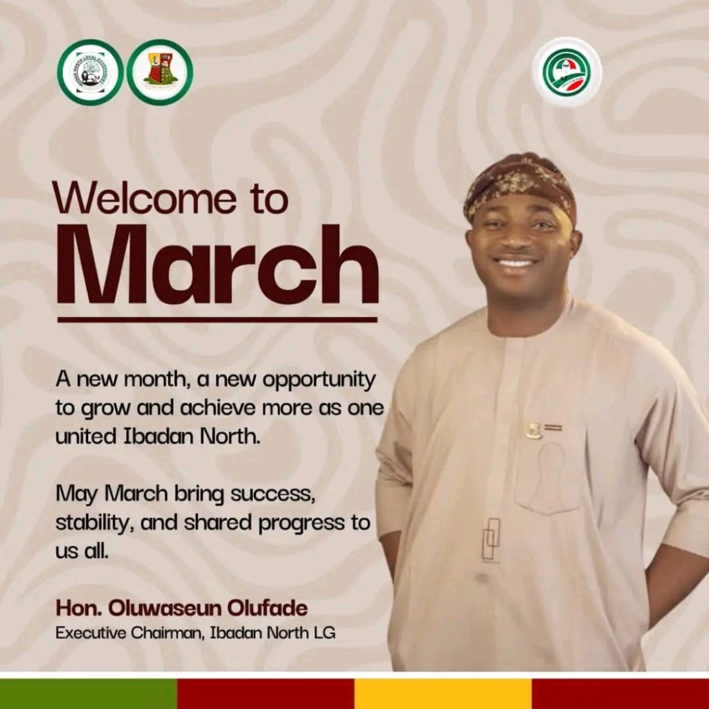 The Executive Chairman of Ibadan North Local Government, Hon. Oluwaseun Olufade, has warmly welcomed residents and staff of the council area to the month of March, urging them to embrace the new month with renewed hope, unity, and dedication to collective progress.