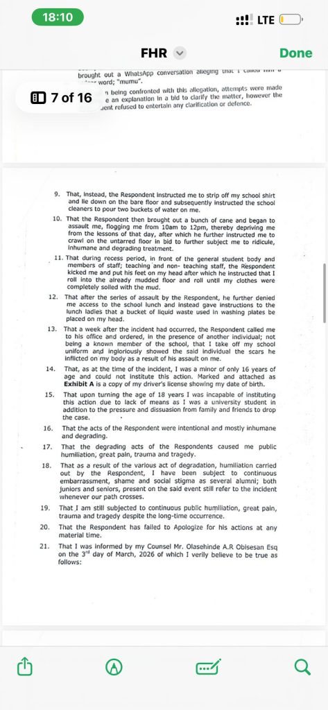 In the lawsuit, the student — now an adult and a legal practitioner — argues that the actions of the school proprietor were inhumane, degrading, and a violation of his fundamental human rights, particularly the right to dignity under the 1999 Constitution of Nigeria and the Child Rights Act.