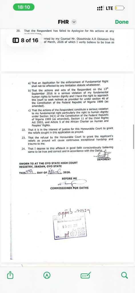 Now an adult and a legal practitioner, the claimant has approached the court seeking justice and redress. He argues that the alleged actions constitute a clear violation of his fundamental rights, particularly his right to dignity as enshrined in the 1999 Constitution of Nigeria and the Child Rights Act.